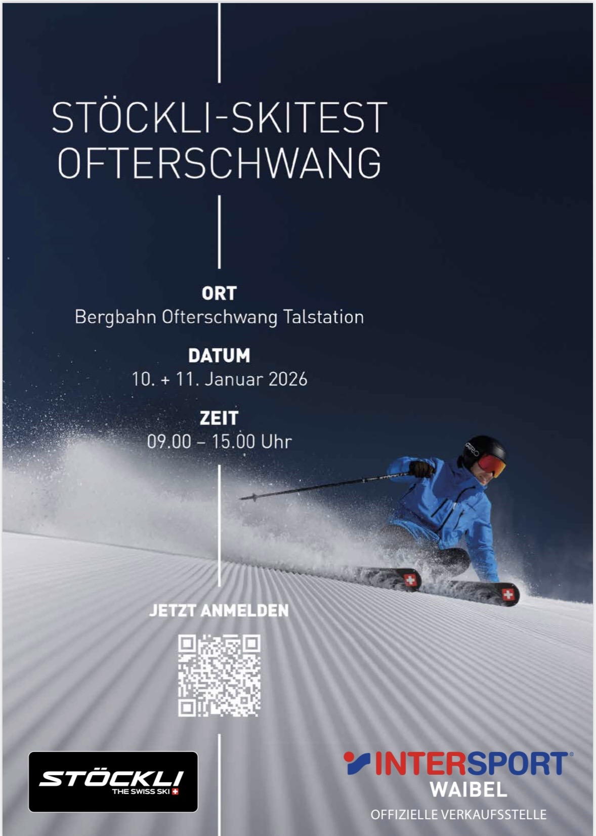 Sport News und Events von Sport Waibel in Sonthofen Zur Anmeldung Kostenloser Stöckli Skitest in Ofterschwang SA, 10.01.2026 + SO, 11.01.2026 Am Samstag 10.01.2026 und Sonntag 11.01.2026 habt Ihr die Möglichkeit alle Stöckli Ski zu testen. Kommt zwischen 9 und 15 Uhr nach Ofterschwang Talstation Weltcup Express vorbei. Der Test ist kostenlos.